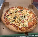 Samuel's special blend of cheese, fresh mushrooms, tomatoes, black olives, green olives, onions & green peppers.